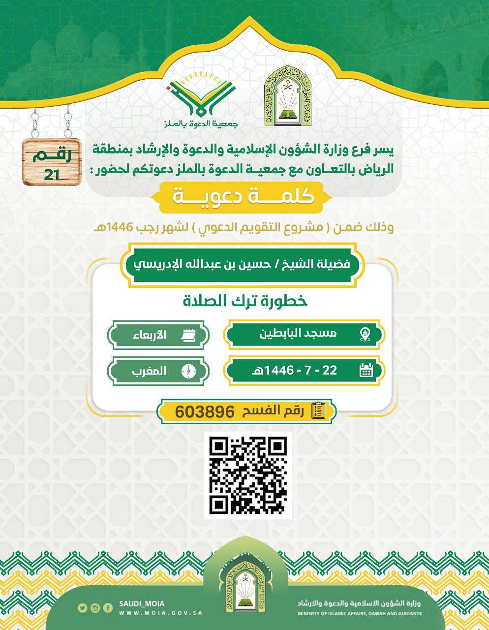 تتشرف جمعية الدعوة بالملز بدعوتكم لحضور سلسلة الكلمات الوعظية رقم (21)، وذلك خلال شهر رجب من عام 1446هـ. نرجو أن تكونوا معنا في هذه اللقاءات المباركة