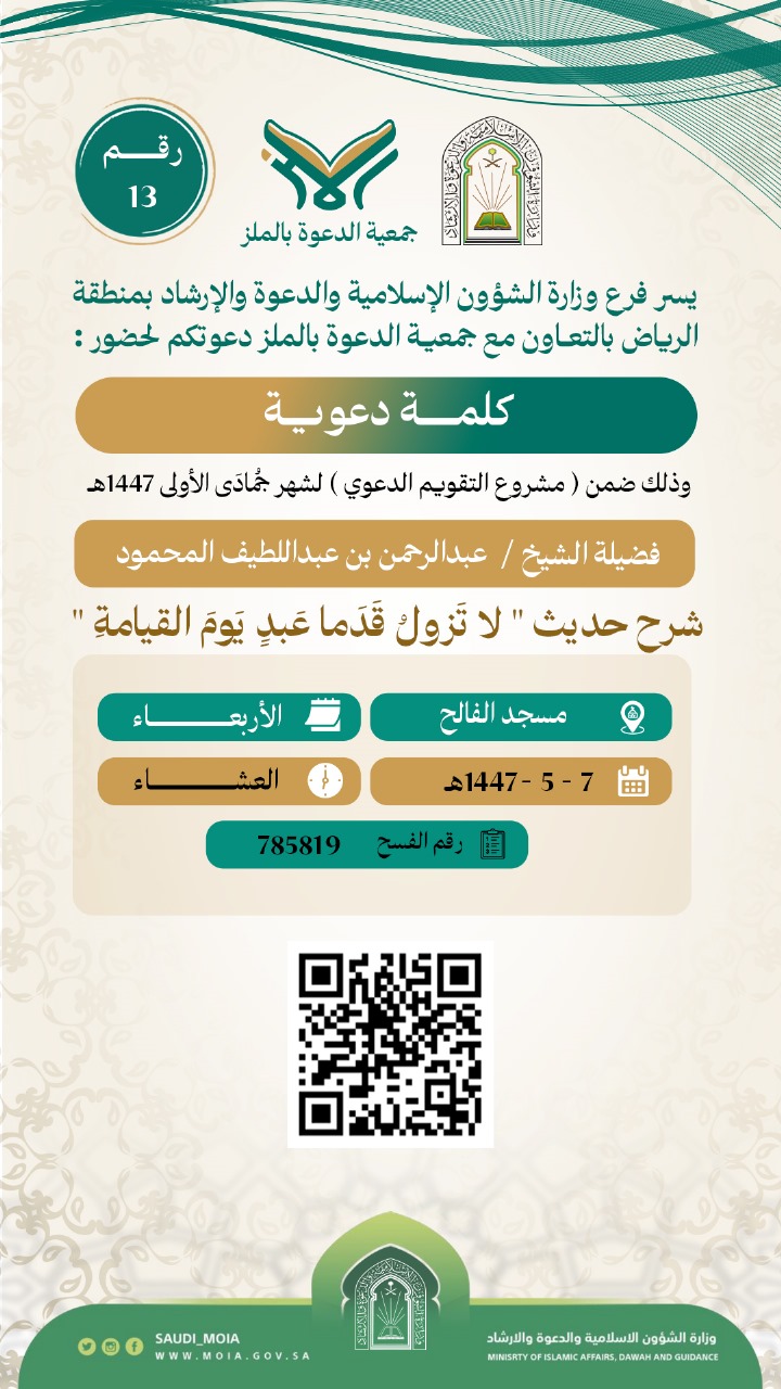 أقامت جمعية الدعوة والإرشاد وتوعية الجاليات بالملز سلسلة من الكلمات الدعوية ضمن إطار "مشروع التقويم الدعوي" لشهر جماى الأول من عام 1447هـ، حيث تناولت هذه الكلمات الموضوع التالية (شرح حديث لا تزول قدما عبد يوم القيامة)