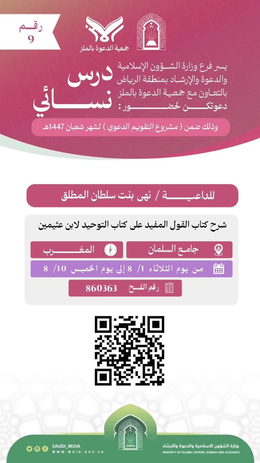 تتشرف جمعية الدعوة بالملز بدعوتكم لحضور درس نسائي رقم (9)، وذلك خلال شهر شعبان من عام 1447هـ. نرجو أن تكونوا معنا في هذه اللقاءات المباركة