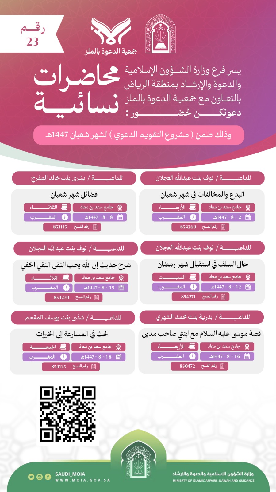 تتشرف جمعية الدعوة بالملز بدعوتكم لحضورمحاضرات دعوية للنساء رقم (23)، وذلك خلال شهر شعبان من عام 1447هـ. نرجو أن تكونوا معنا في هذه اللقاءات المباركة