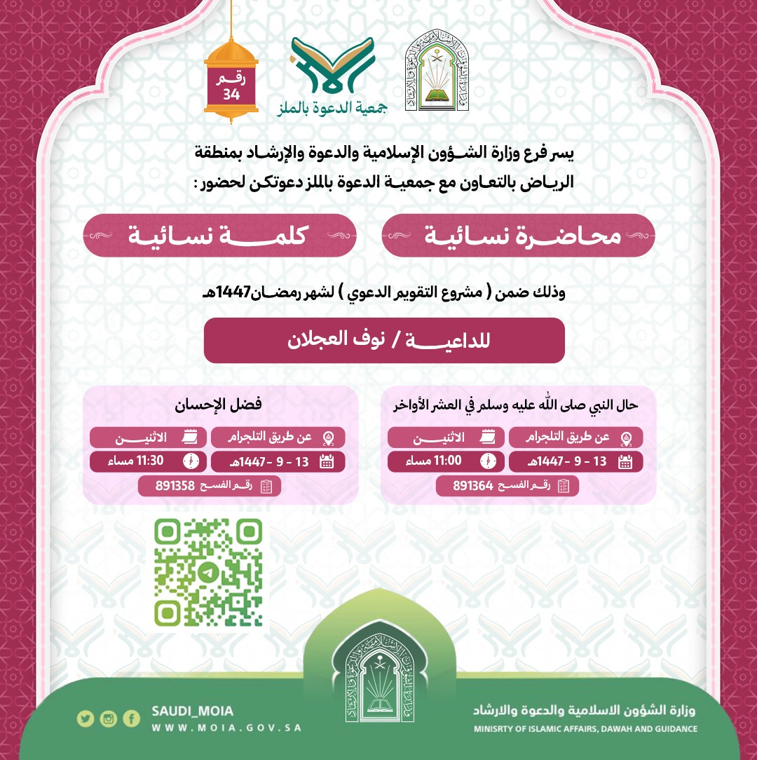 تتشرف جمعية الدعوة بالملز بدعوتكم لحضورمحاضرات نسائية رقم (34)، وذلك خلال شهر رمضان من عام 1447هـ. نرجو أن تكونوا معنا في هذه اللقاءات المباركة