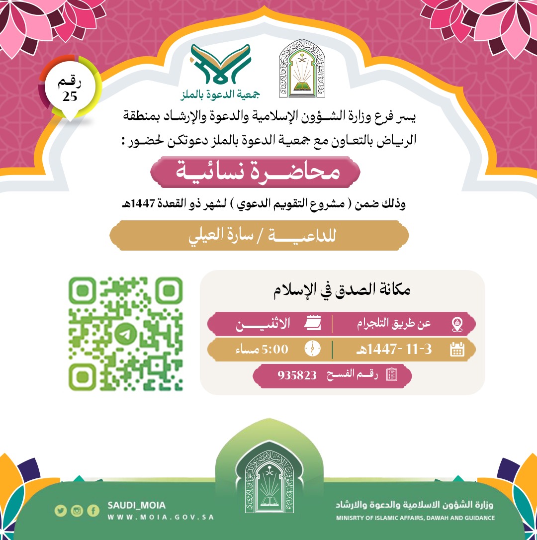 تتشرف جمعية الدعوة بالملز بدعوتكم لحضورمحاضرات نسائية عن بعد عبر منصة التليجرام رقم (16)، وذلك خلال شهر ذو القعدة من عام 1447هـ. نرجو أن تكونوا معنا في هذه اللقاءات المباركة