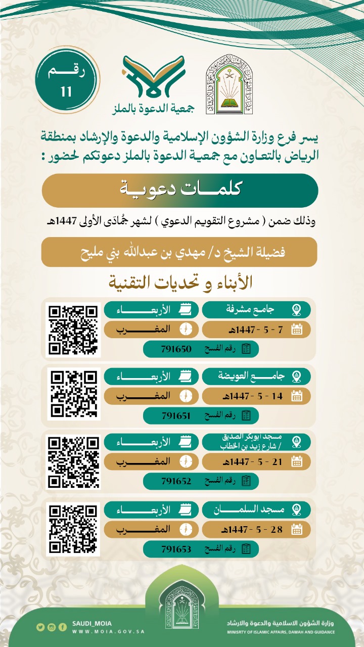 تعلن جمعية الدعوة بالملز عن إقامة سلسلة من الكلمات الدعوية رقم (11) في شهر جمادى الأول لعام 1447هـ