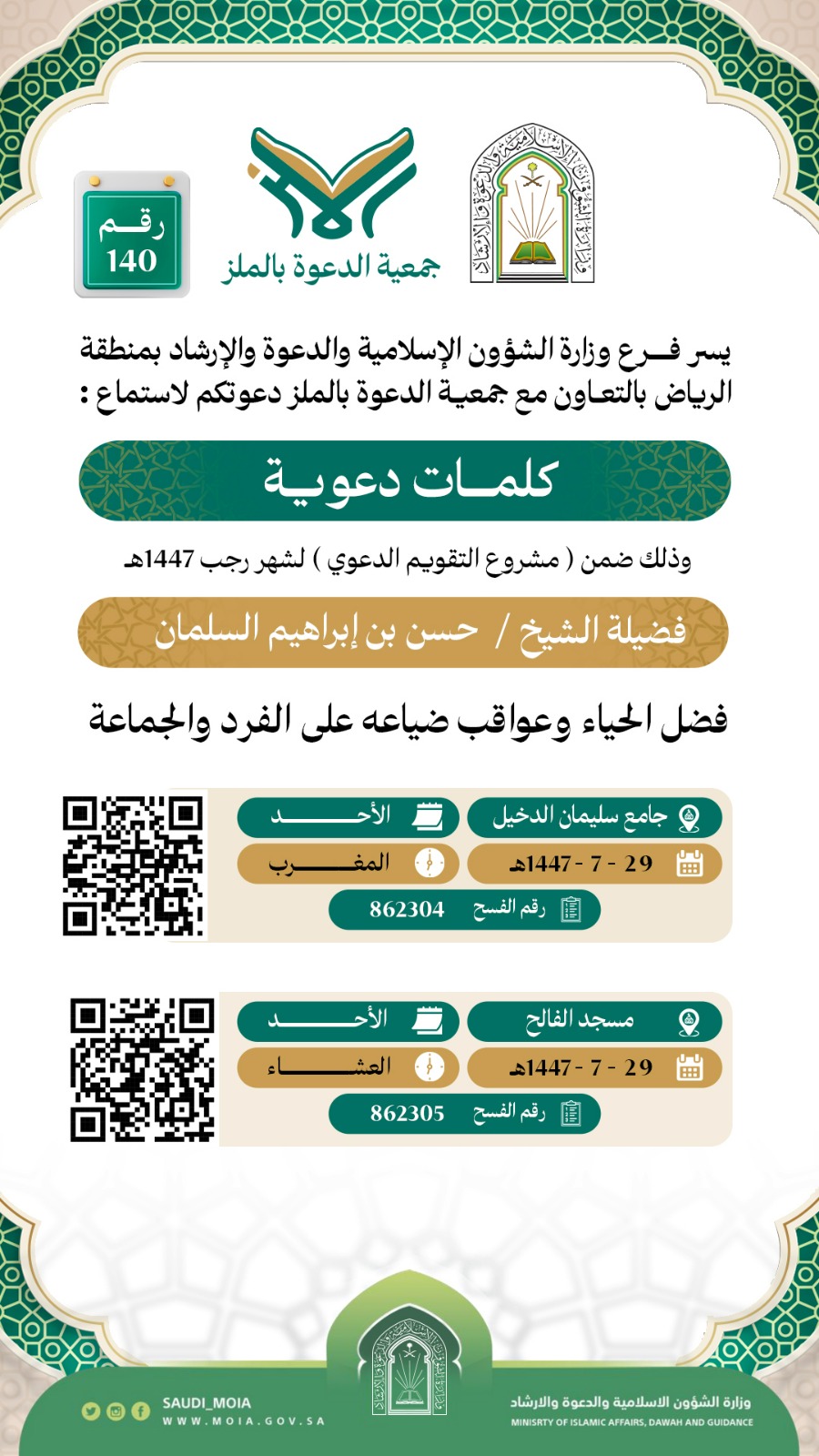 تعلن جمعية الدعوة بالملز عن إقامة كلمات دعوية رقم (140) في شهر رجب لعام 1447هـ