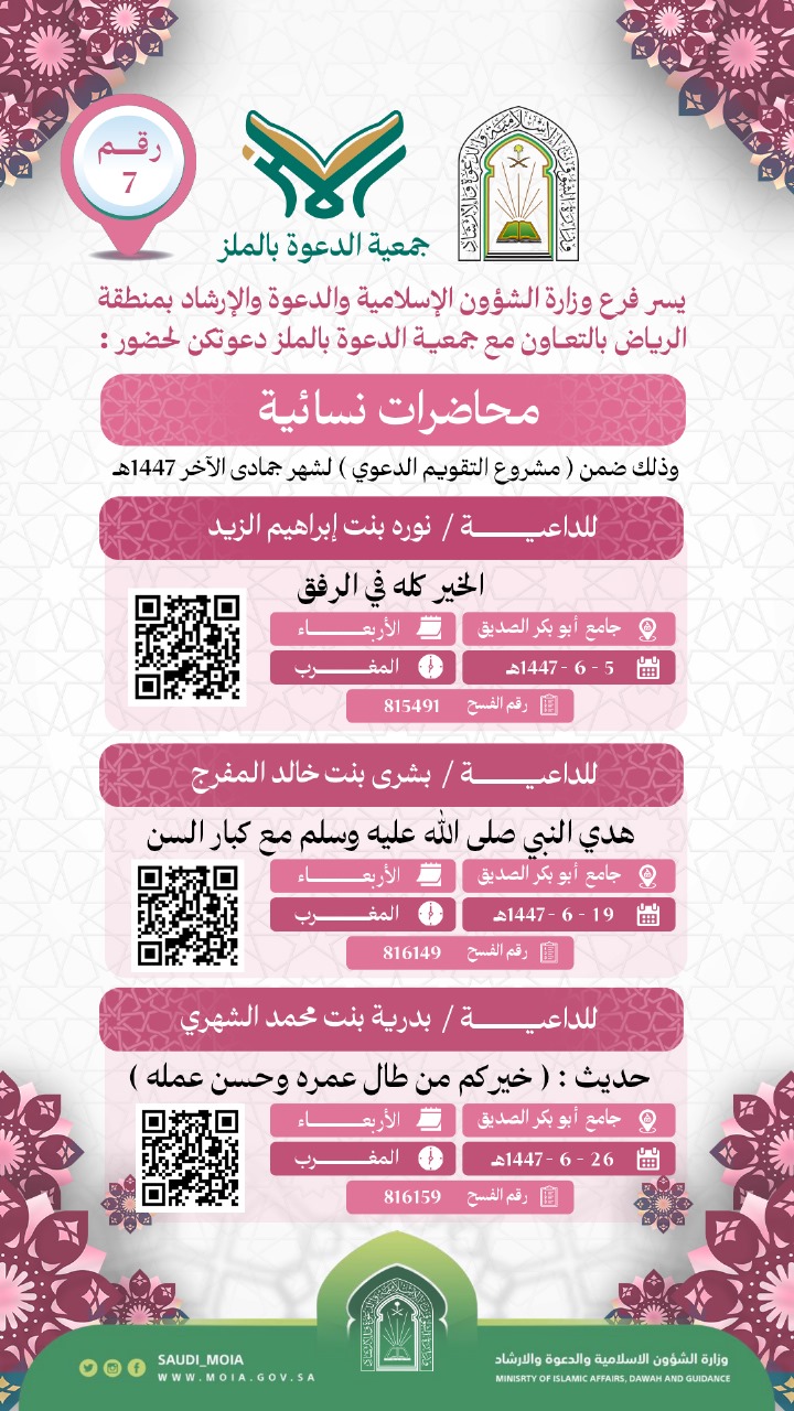 يسر جمعية الدعوة بالملز دعوتكم لحضور محاضرات نسائية رقم(7) ضمن (مشروع التقويم الدعوي) لشهر جمادى الآخر لعام 1447هـ