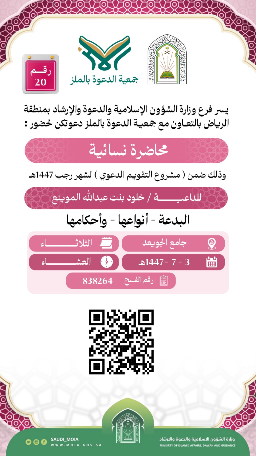 يسر جمعية الدعوة بالملز دعوتكم لحضور محاضرة للنساء رقم(20) ضمن (مشروع التقويم الدعوي) لشهر رجب لعام 1447هـ