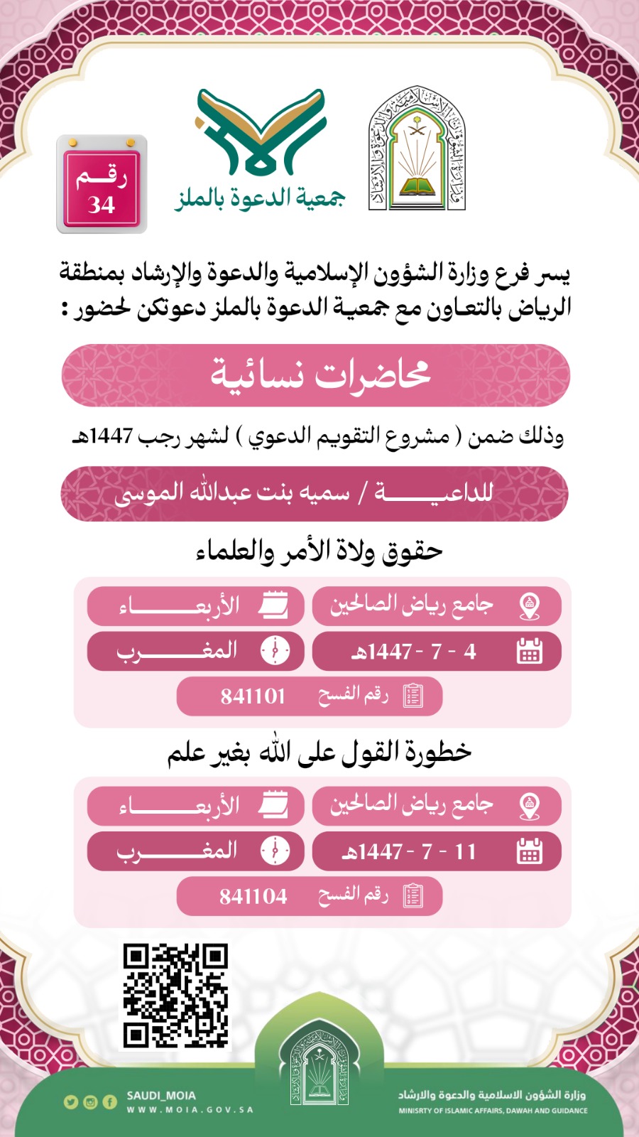يسر جمعية الدعوة بالملز دعوتكم لحضور محاضرات للنساء رقم(34) ضمن (مشروع التقويم الدعوي) لشهر رجب لعام 1447هـ